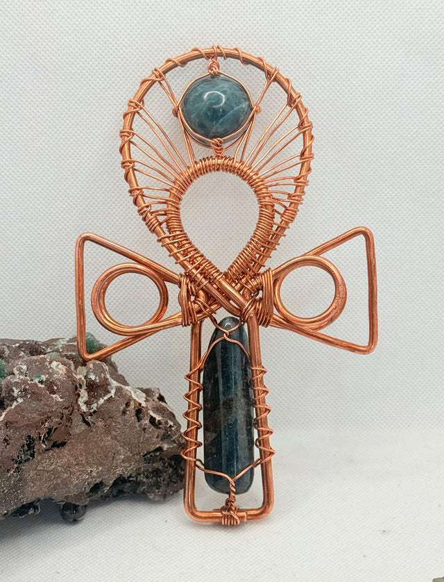 Blue Calchedony and Blue Kyanite Copper Crystal Handheld Ankh
