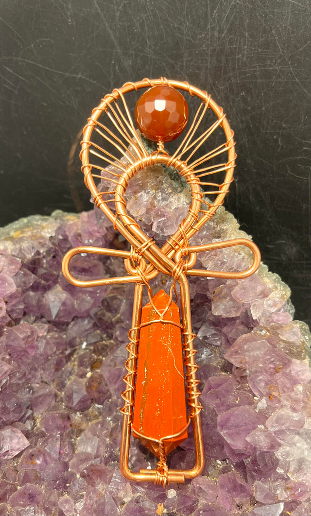 Rhodochrosite and Ruby Egg Handheld Ankh