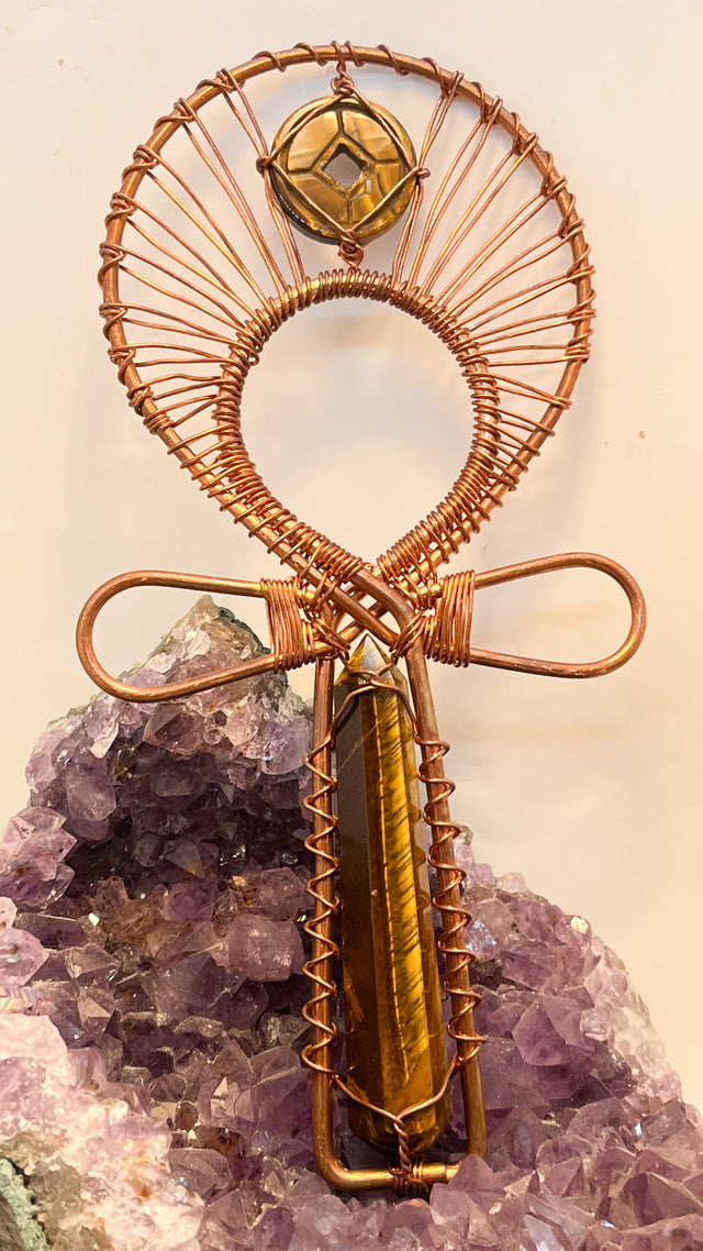 Tigers Eye Tower Copper Ankh Wirewrapped Pendant